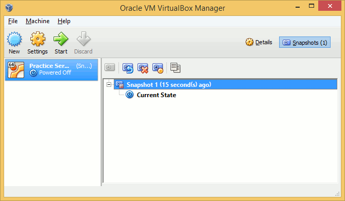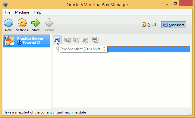 When the server has shutdown, go back to the VirtualBox Manager, select your practice VM, go to the Snapshots tab, then click the Take Snapshot button.