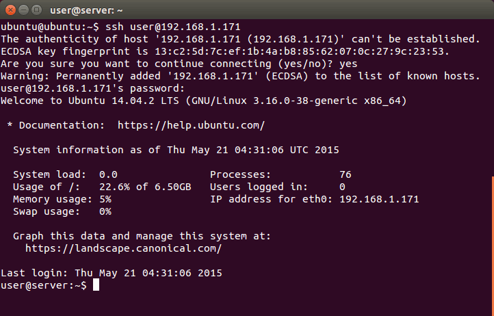 Either way, the server will ask you for the user’s password. It may also ask you to verify the authenticity of the host (it’s local so just say “yes”). Once logged in, you now have full remote control of the server.