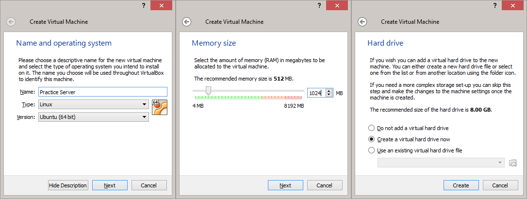 It’s not expensive to practice using a VPS - VPSs are rented for a few cents an hour while some services line Amazon just require a credit card for using their free-tier. However, to avoid potentially expensive accidents like forgetting to destroy a VPS after practice, we will be asking you, the beginner, to practice on Virtual Machines (VM) running on your computer.