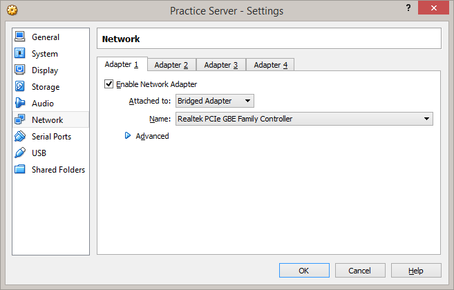 - Network - you have two main choices for networking: NAT and Bridged Adapter