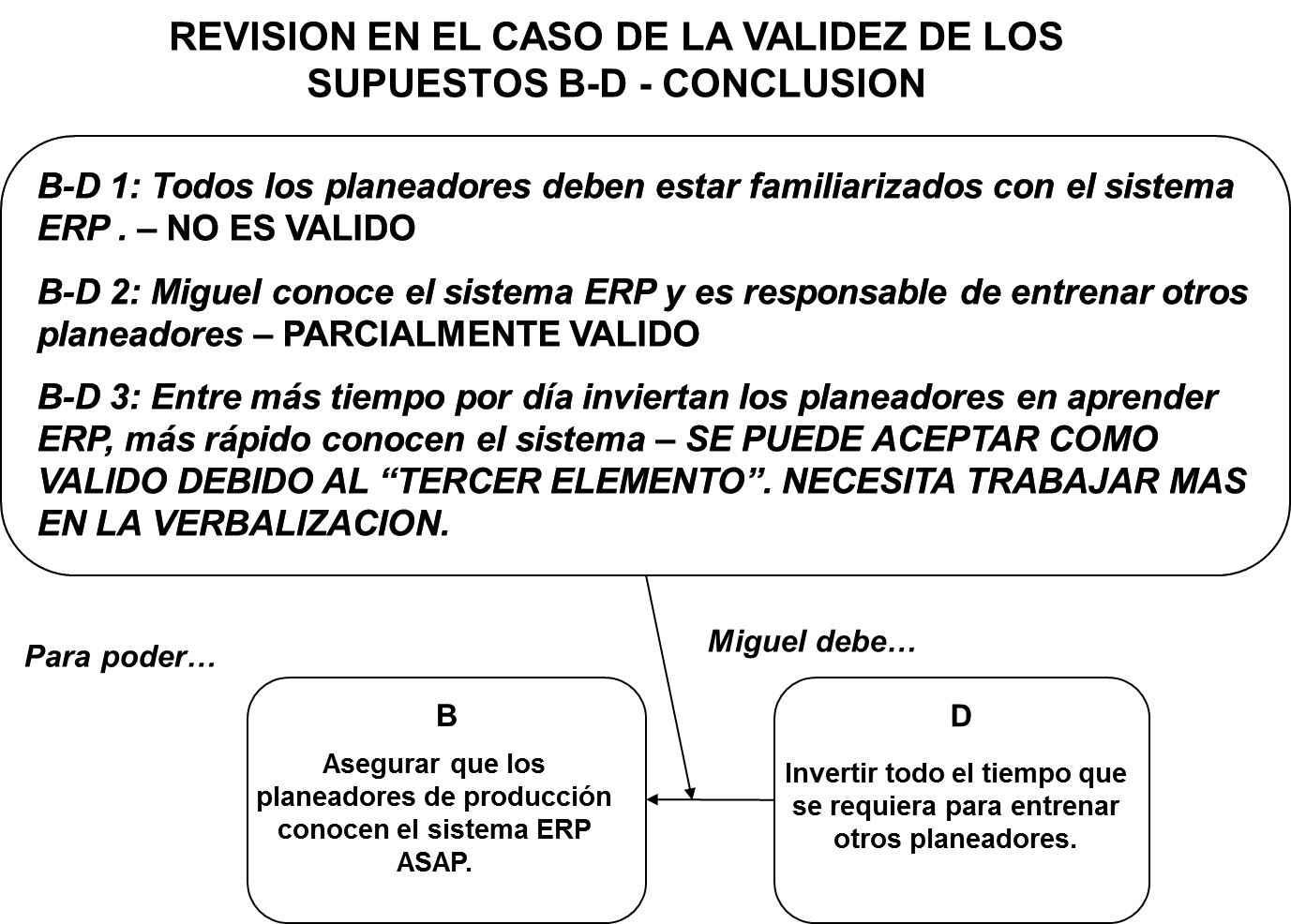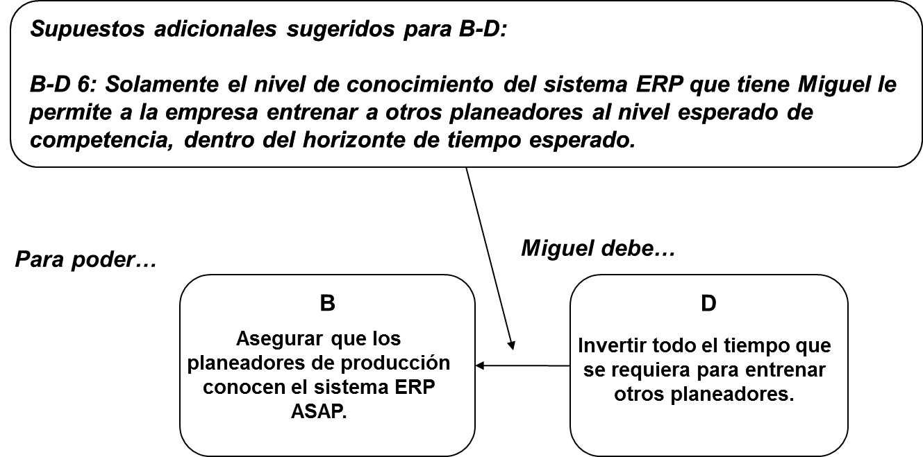 Conclusión: Nuestro supuesto sugerido B-D 6, “Solamente el nivel de conocimiento del sistema ERP que tiene Miguel le permite a la empresa entrenar a otros planeadores al nivel esperado de competencia, dentro del horizonte de tiempo esperado”, es válido.