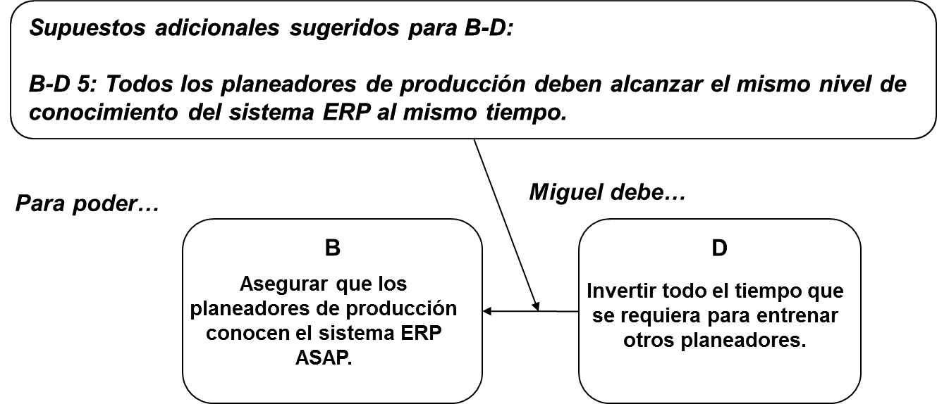 Aquí es importante reconocer que este supuesto enlaza el sentimiento de Miguel de que es forzado a invertir tanto tiempo como sea necesario para el entrenamiento (entidad D) con la presión del elemento tiempo en la entidad B - “tan pronto como sea posible”, lo que en este caso implica “dentro del tiempo esperado más corto”. En la entidad B, el “tan pronto como” es determinado por el sistema. Si “tan pronto como” pudiera ser determinado por Miguel, no habría presión de tiempo sobre él. El siempre va a saber que, si llega un momento en que aún un planeador no tiene el conocimiento esperado del sistema, va a ser debido a que, hasta ese momento, no ha sido “posible” (debido al ritmo de aprendizaje del planeador o debido a que Miguel ha estado ocupado con otras cosas diferentes al entrenamiento). En su momento correcto, cuando sea posible, cada planeador va a conocer el sistema.
