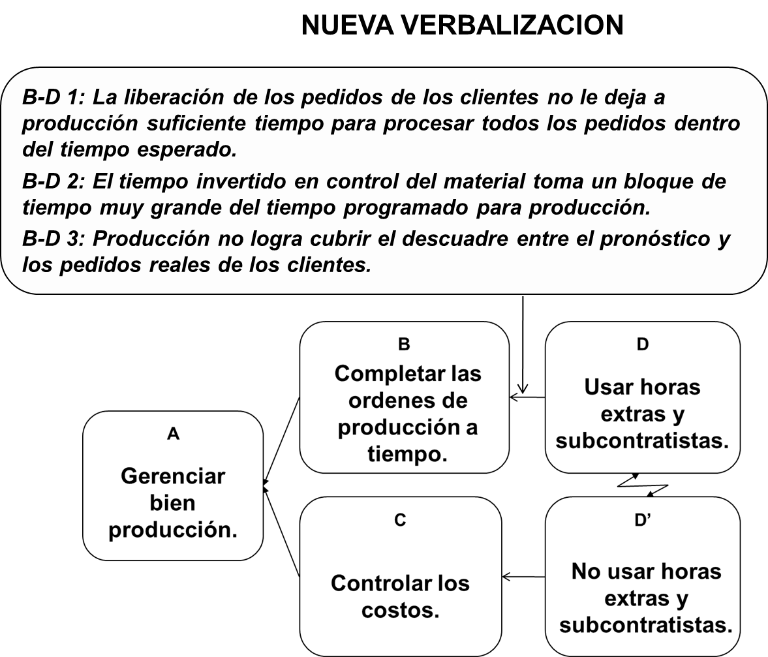 Vemos que el tema de la capacidad es central en todos los tres supuestos. Realmente, es central al enlace B-D: para poder cumplir con los pedidos a tiempo, debemos usar sobre tiempo y subcontratistas, debido a que, internamente, no tenemos capacidad suficiente.