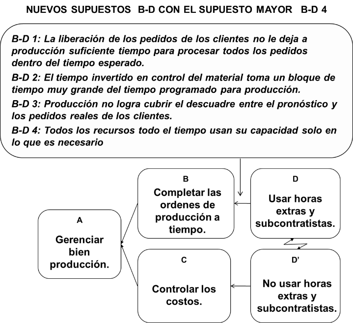 Por medio de un análisis más profundo del significado de los supuestos B-D 1, B-D 2, y B-D 3, hemos identificado el supuesto B-D 4 “Todos los recursos todo el tiempo usan su capacidad solo en lo que es necesario”. Es el supuesto mayor que justifica el enlace B-D.