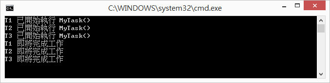 這裡使用了 Task.Run() 來建立並起始一個非同步工作,並且使用 lambda 表示式來撰寫委派方法。另外還在應用程式結束之前呼叫 Task 物件的 Wait 方法來等待非同步工作執行完畢。