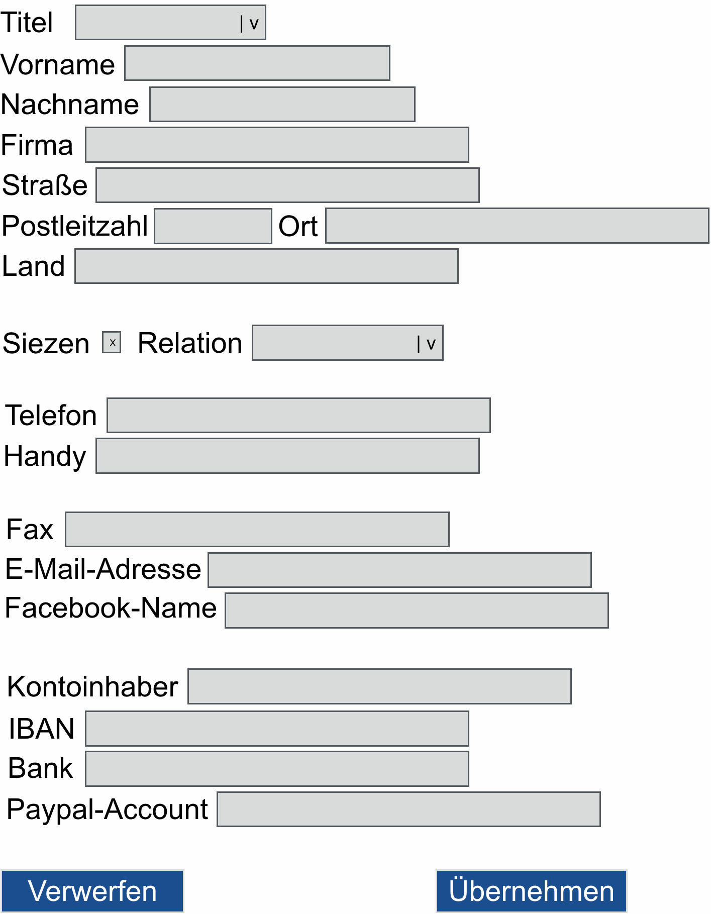 Lassen Sie uns zum Abschluss einen Großteil der in diesem Kapitel erarbeiteten Gestaltungshinweise an einem realistischen Beispiel zusammenfassen. Unsere Aufgabe ist es, eine Eingabemaske für einen Eintrag in eine Personendatenbank zu gestalten. Als Felder für die Datenbank sind (etwas willkürlich) Vorname, Nachname, Firma, Straße, Ort, Postleitzahl, Land, Anredeform(Siezen/Duzen), Relation, Telefon, Handy, Fax, Titel, E-Mail-Adresse, Facebook-Name, Kontoinhaber, IBAN, Bank und PayPal-Account vorgesehen. Ferner braucht unsere Maske je einen Button zum Übernehmen und Verwerfen der Daten.