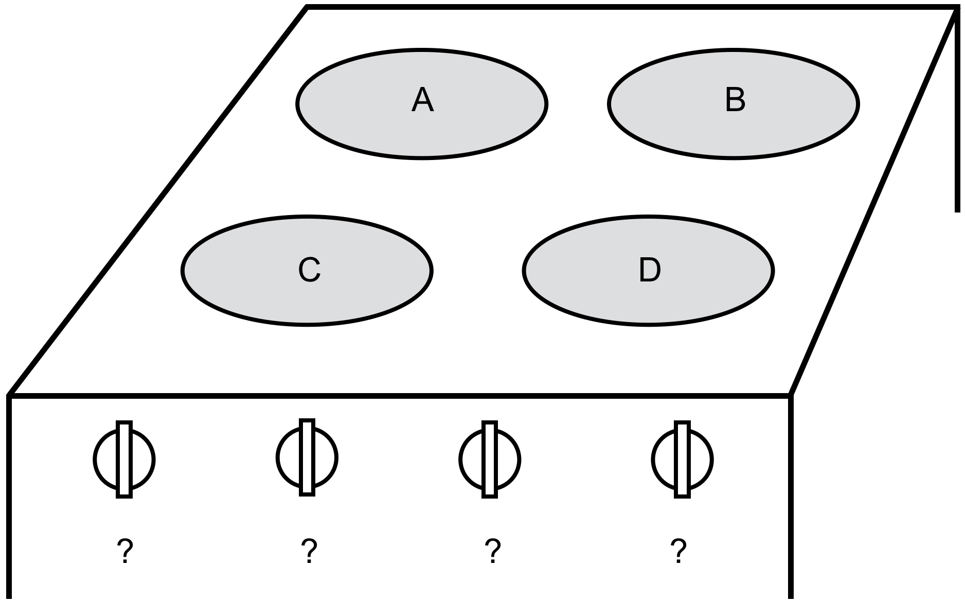 Bei diesem Herd, der zugegebenermaßen ein wenig seltsam anmutet, treten keine Zuordnungsfehler mehr auf. Wieso ist das so? Es sind lediglich die oberen beiden Platten ein wenig nach links, die unteren beiden ein wenig nach rechts angeordnet. Diese kleinen Verschiebungen verkörpern eine Zusatzinformation, mithilfe derer sich eine eindeutige Zuordnung ergibt. Diese Abweichung von der Symmetrie bringt die Platten in eine definierte Reihenfolge, die der Anordnung der Stellglieder entspricht.