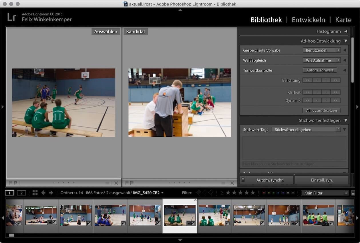 Schauen Sie sich erneut den obigen Screenshot von Lightroom an. Wir befinden uns gerade im Entwicklungs-Modus. Das Ziel ist nun, die Belichtung dieses Bildes zu optimieren. Dazu soll es mit einem Referenzbild verglichen und entsprechend angepasst werden. Das Vorhaben besteht also aus drei Schritten: In einen Bildervergleich wechseln, den Bildervergleich beenden, die Belichtung gegebenenfalls anpassen