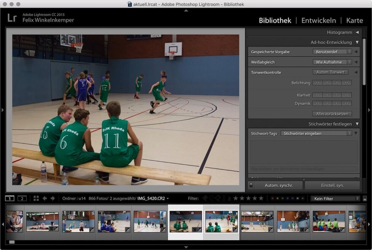 Mit dem nächsten Beispiel verlassen wir den Bereich der anachronistisch wirkenden Nutzungsschnittstellen und schauen uns die aktuelle Software Lightroom7 von Adobe an. Lightroom ist eine Anwendung, die es zum einen erlaubt, Bilder zu verwalten und zu sortieren. Zum anderen verkörpert sie einen sogenannten RAW-Entwickler, mit dem die Rohdaten digitaler Kameras bearbeitet werden können. Die Entwickler haben für diese beiden Aufgabenbereiche zwei verschiedene Modi eingerichtet. Es kommen noch einige weitere Aufgaben wie das Erstellen von Diashows und Fotobüchern hinzu, die wir an dieser Stelle aber nicht betrachten wollen. Für unsere Betrachtung reichen zwei Modi, „Bibliothek“ und „Entwickeln“ genannt.