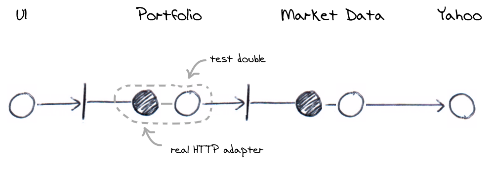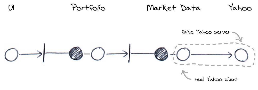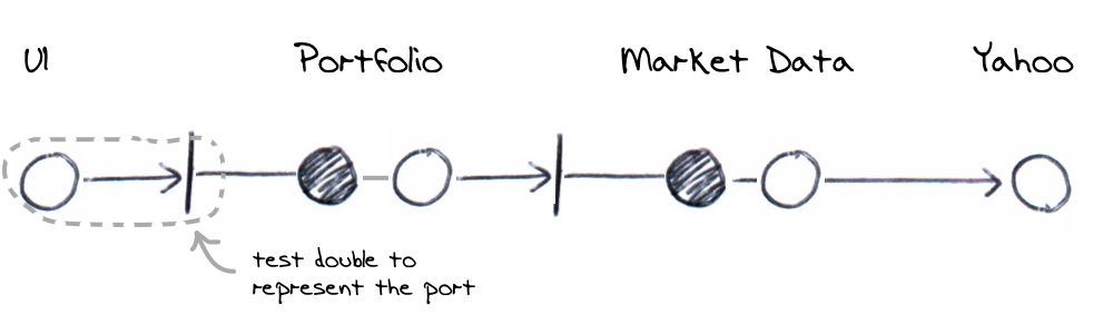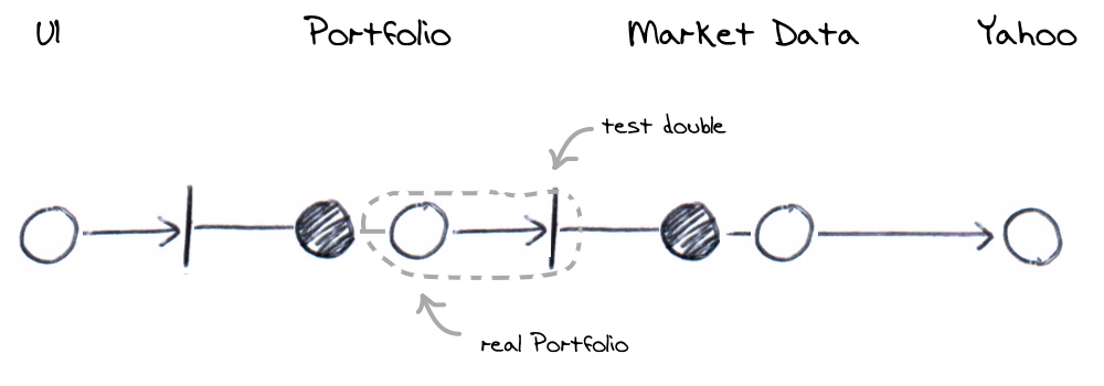In terms of our sample application, the UI makes a HTTP GET call to the backend. It’s implemented by a ajax call inside a HTML page. In testing however, we’ll replace the Portfolio with a test double and therefore just test that the UI correctly displays whatever the test double returns. Specifically then, we’d