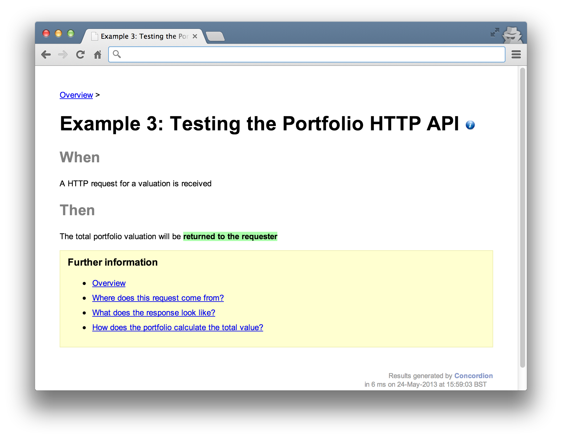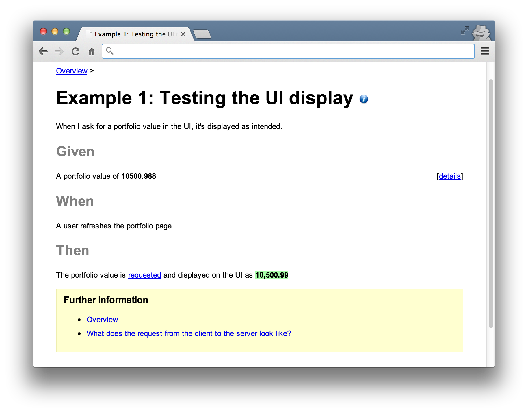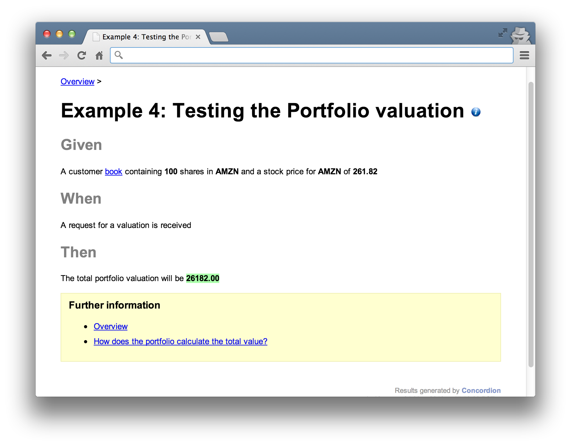 We’ll use Concordion as the framework for automating this as a test. We use HTML to document the specification and use Concordion to execute it like a regular JUnit test. You markup the HTML to encode instructions that Concordion interprets at runtime to call application logic and make assertions. After it’s done, it outputs the result as a modified version of the specification. It’s not important that we’re using Concordion. What is important is that we’re producing readable artifacts for the customer.