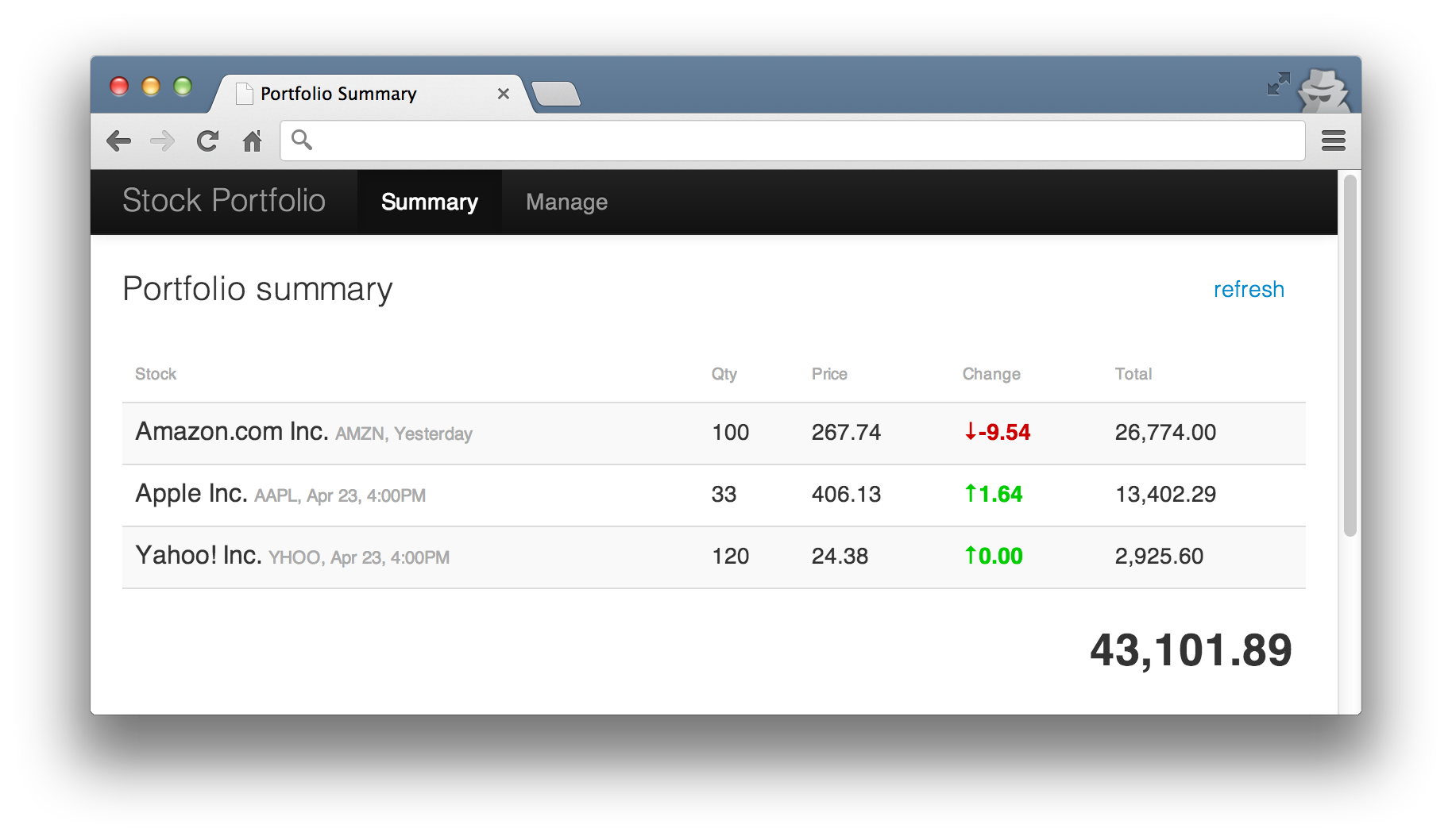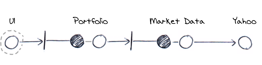 Lets imagine a system concerned with helping customers manage their stock portfolio. It displays details about stocks owned and allows the customer to buy and sell directly with an exchange. The system is made up of a browser based UI and a RESTful backend server. The backend uses a market data service provided by Yahoo to retrieve stock prices and connects directly to an exchange to execute trades.