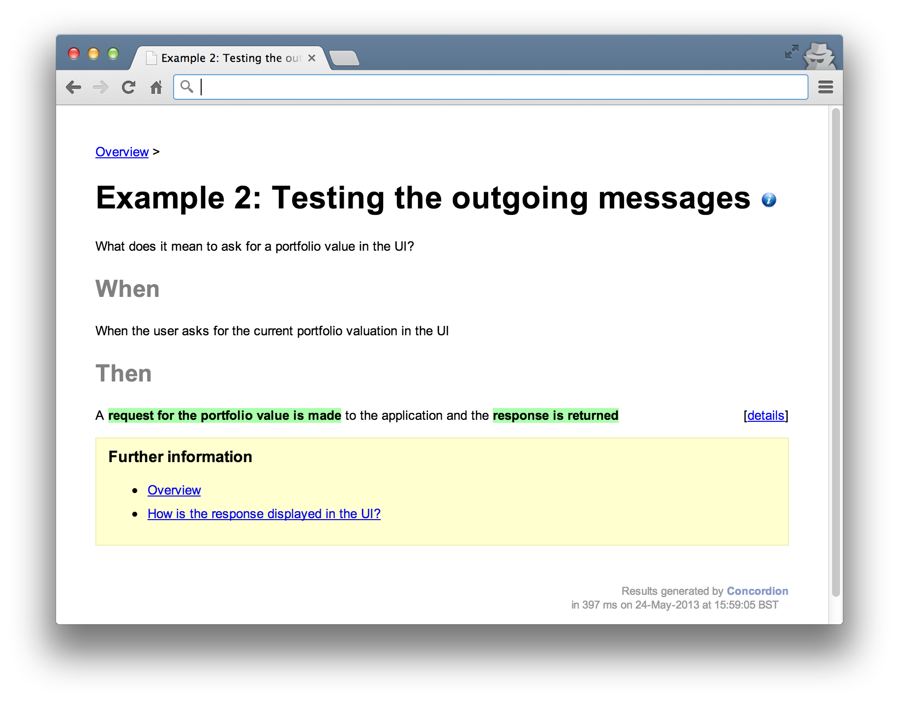 When all the examples are run together they give a sensible amount of coverage without the duplication. The tests are meant to be demonstrative rather than exhaustive; they don’t represent the full suite of tests you’d write in a production system but give you an idea of what component interactions should be tested. You may or may not choose to include addition business scenarios or interactions.