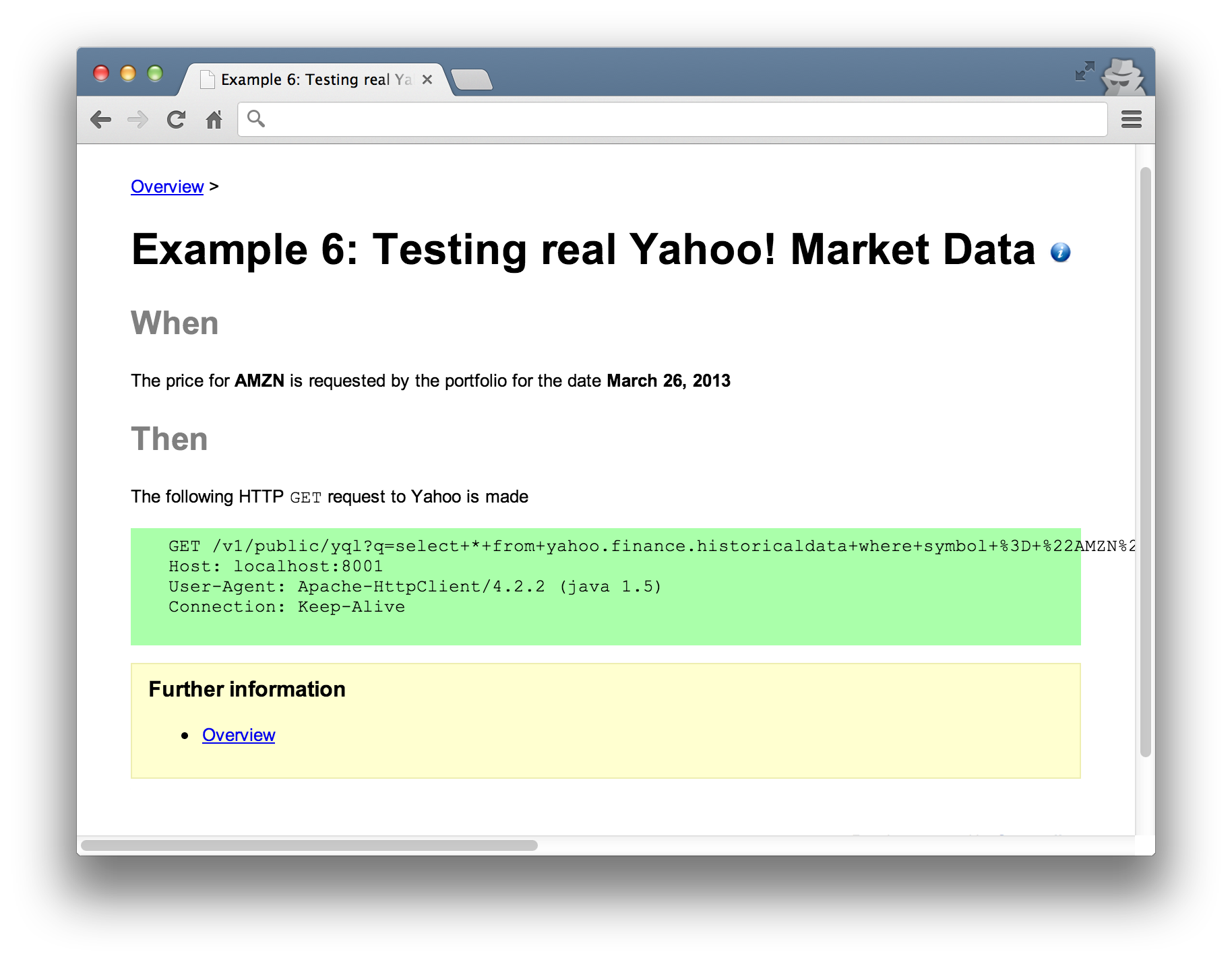 We’d also need tests to ensure that the real Yahoo market data component operates as expected. We’ve already built our market data adapter that we fake out in the previous tests (Example 5.) but now we need to make sure that how we expect fake market data components to behave in tests is actually how they behave with real Yahoo.