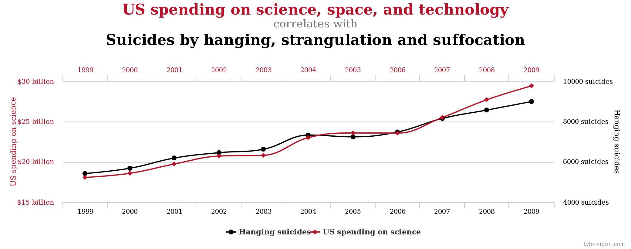 É sempre válido reforçar que correlação não implica causalidade. A simples verificação de uma forte correlação entre duas variáveis não é suficiente para determinar a relação de causalidade entre elas. Tanto a correlação percebida visualmente como através da medida do coeficiente de correlação podem ocorrer entre variáveis que não tem nenhuma relação entre si. Esse tipo de correlação é chamdo de correlação espúria. Para maiores exemplos de correlações espurias veja o site http://www.tylervigen.com/spurious-correlations, de onde foi obtida a imagem abaixo, que mostra um exemplo de correlação meramente espúria.
