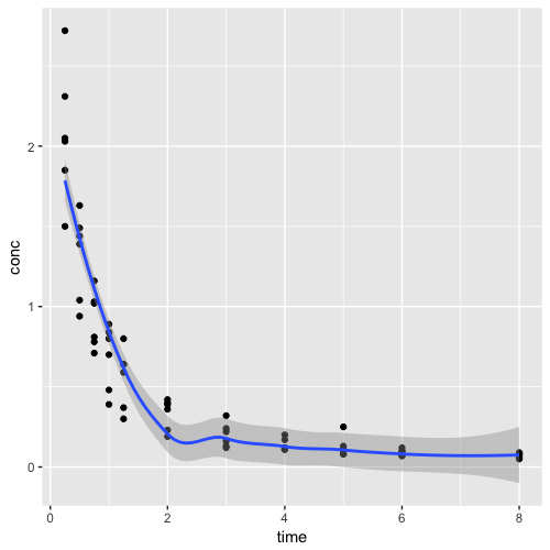 1 ggplot(data=Indometh, aes(x=time, y=conc)) +