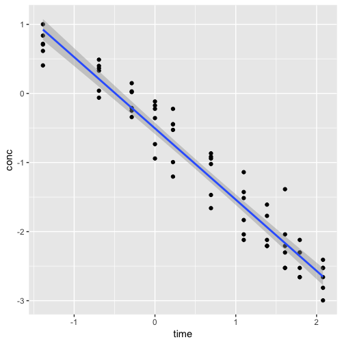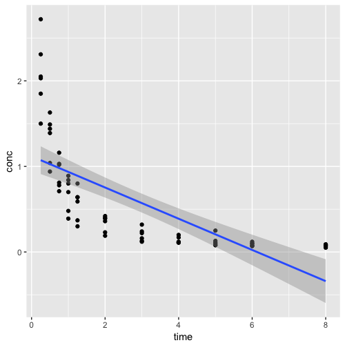9 ggplot(data=log.Indometh, aes(x=time, y=conc)) +