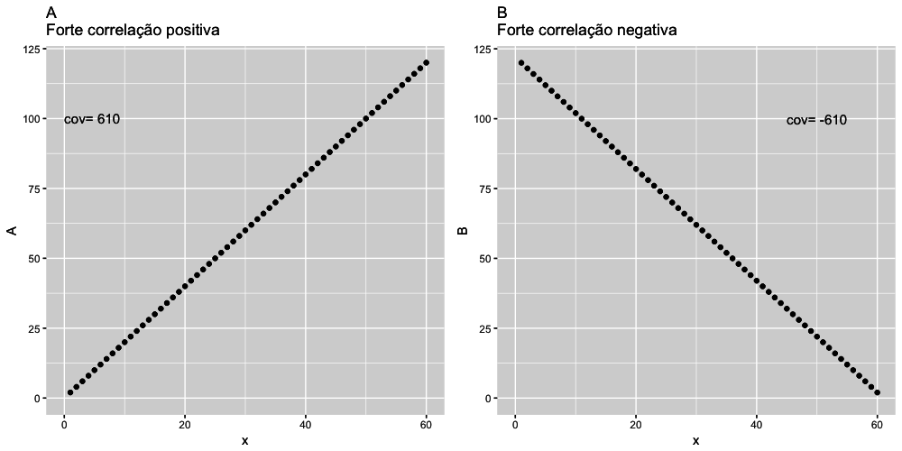 Mas não se assuste com essa fórmula. Todos esses cálculos serão feitos automaticamente pelo R. O importante aqui é entender que quando os desvios são no mesmo sentido o sinal será positivo, quando os desvios são em sentidos diferentes o resultado será negativo. Ou seja, uma covariância positiva indica uma relação linear positiva entre as variáveis, e uma covariância negativa indica o oposto. Os gráficos abaixo ajudarão a compreender o que significa uma covariância positiva e negativa.