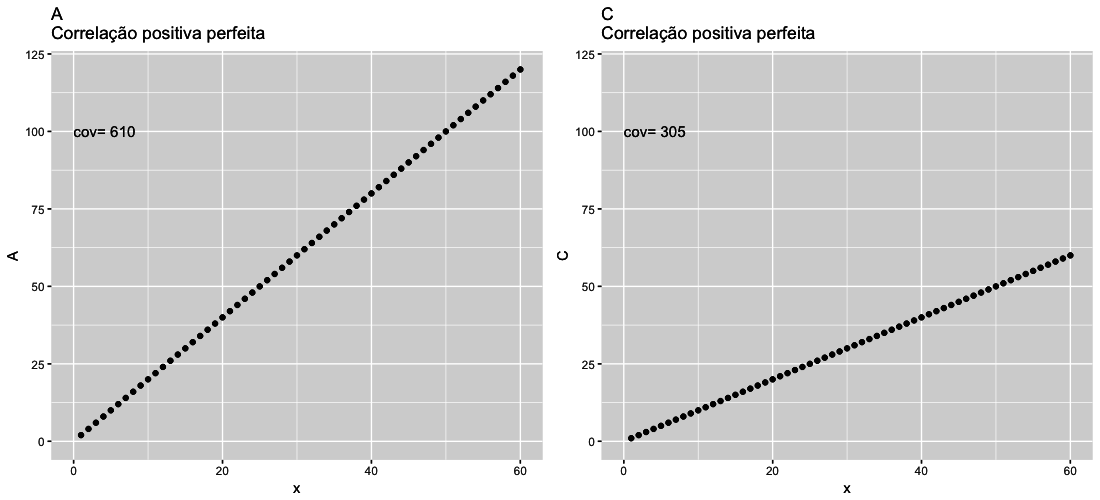 Essa análise pode ser apenas visual ou calculada pelo que se chama de covariância: ou seja, o quanto as variáveis variam de forma conjunta. Quando ambas as variáveis variam na mesma direção, ou seja, uma aumenta quando a outra aumenta, ou uma diminui quando a outra diminui, a direção da variação é positiva, ou seja, a covariância é positiva.