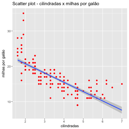 No capítulo passado adicionamos uma reta de regressão a esse gráfico com as funções gráficas básicas do R. Para efeitos didáticos, vamos novamente adicionar uma reta de regressão nesse gráfico, mas agora usando o ggplot2.