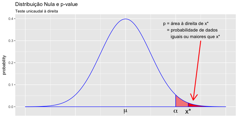 A definição do valor de $p$ é a probabilidade de encontrarmos os dados da pesquisa, ou dados mais extremos, supondo que a hipótese nula seja verdadeira. Ou seja, o valor de $p$ é calculado levando em conta como os dados estariam distribuídos caso a hipótese nula fosse verdadeira. Isso significa que o valor de $p$ é calculado a partir da distribuição nula.