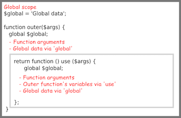 PHP’s closure mechanism has an advantage over that of JavaScript’s in that, instead of simply capturing all of the state around an anonymous function declaration, you can explicitly declare which variables the it’s permitted to access via the use keyword.