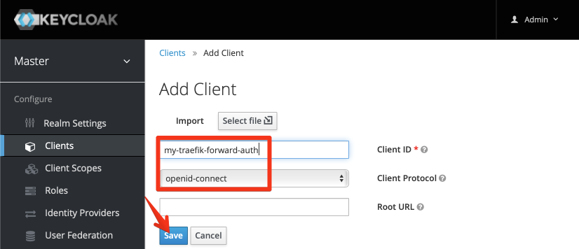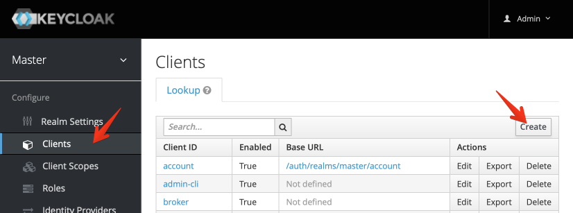 Within the “Master” realm (no need for more realms yet), navigate to Clients, and then click Create at the top right: