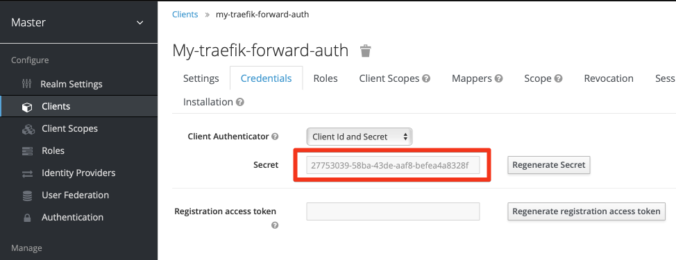 Now that you’ve changed the access type, and clicked Save, an additional Credentials tab appears at the top of the window. Click on the tab, and capture the KeyCloak-generated secret. This secret, plus your client name, is required to authenticate against KeyCloak via OIDC.