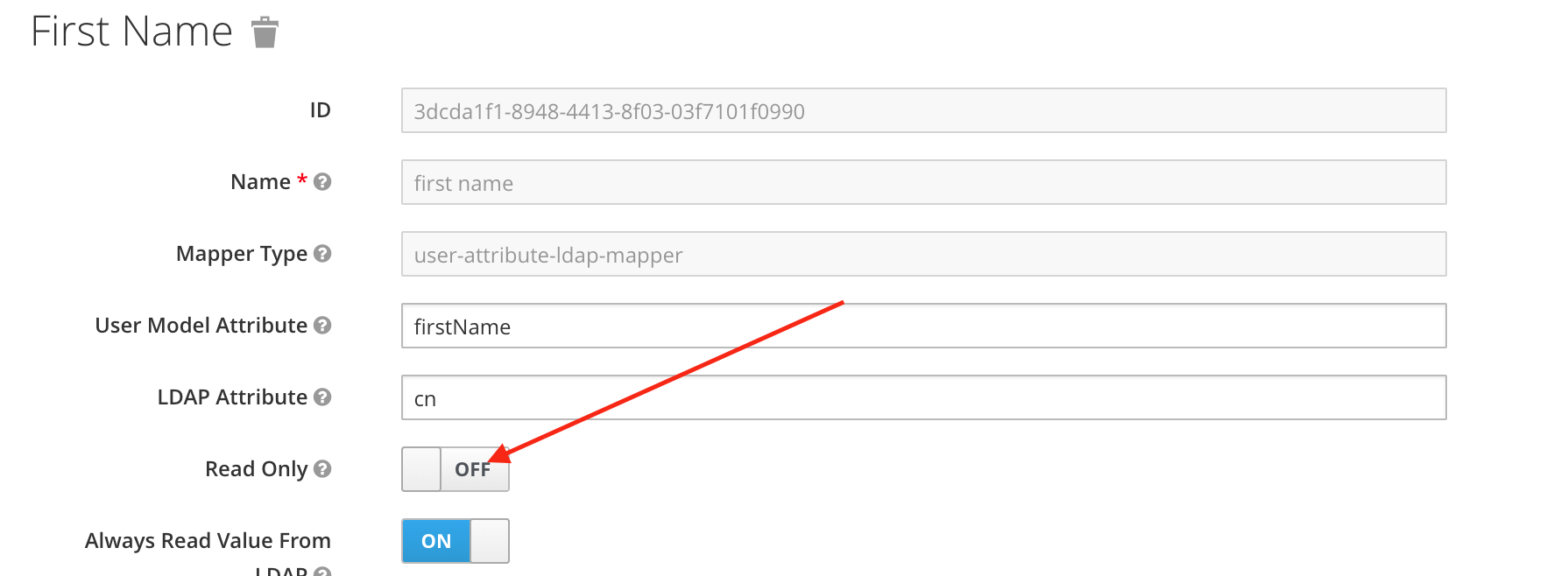For each of the following mappers, click the name, and set the “Read Only” flag to “Off” (this enables 2-way sync between KeyCloak and OpenLDAP)