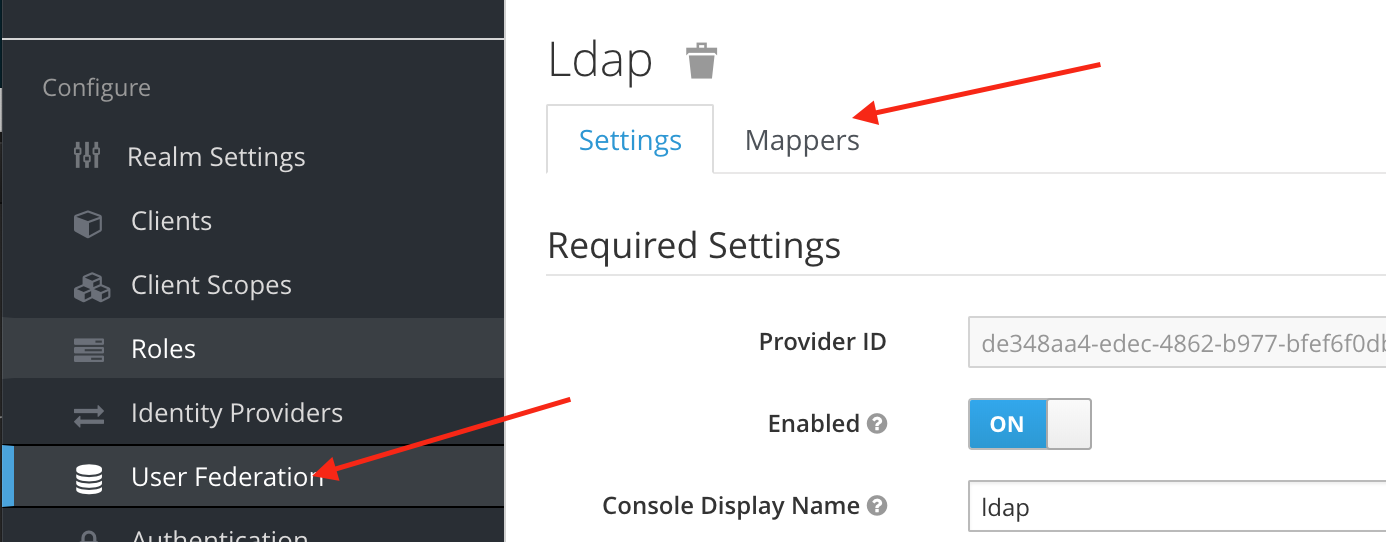 Once in the desired realm, click on User Federation, and click Add Provider. On the next page (“Required Settings”), set the following: