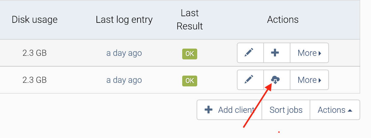 wasTo restore files form a job, click on the “Restore” button in the WebUI, while on the Jobs tab: