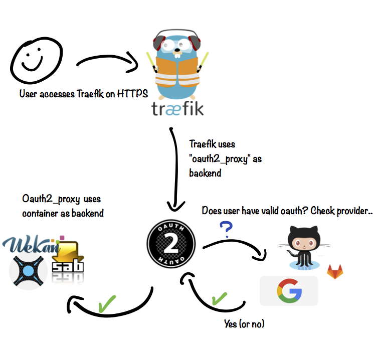 When employing the OAuth proxy , the proxy sits in the middle of this transaction - traefik sends the web client to the OAuth proxy, the proxy authenticates the user against a 3rd-party source (GitHub, Google, etc), and then passes authenticated requests on to the web app in the container.