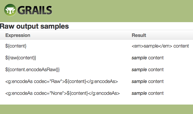 But sometimes we do want to output unescaped HTML content in the web browser. For example we generate the value ourselves and we know the value is safe and cannot be misused for XSS attacks. In Grails 2.3 we can use a new raw() method in our GSPs, tag libraries or controllers. The method will leave the content unchanged and return the unescaped value to be displayed. Alternatively we can use encodeAsRaw() on the content we want to leave unescaped. Finally the encodeAs tag accepts Raw or None as values for the attribute codec and will return the unescaped value.