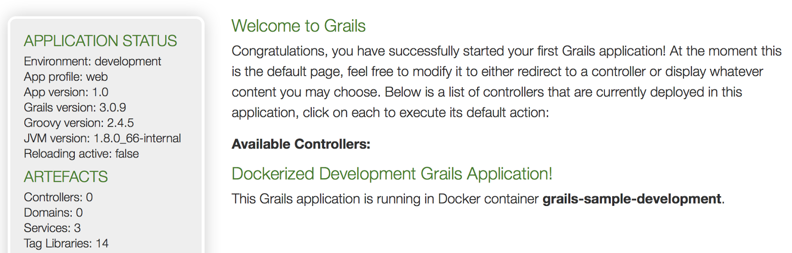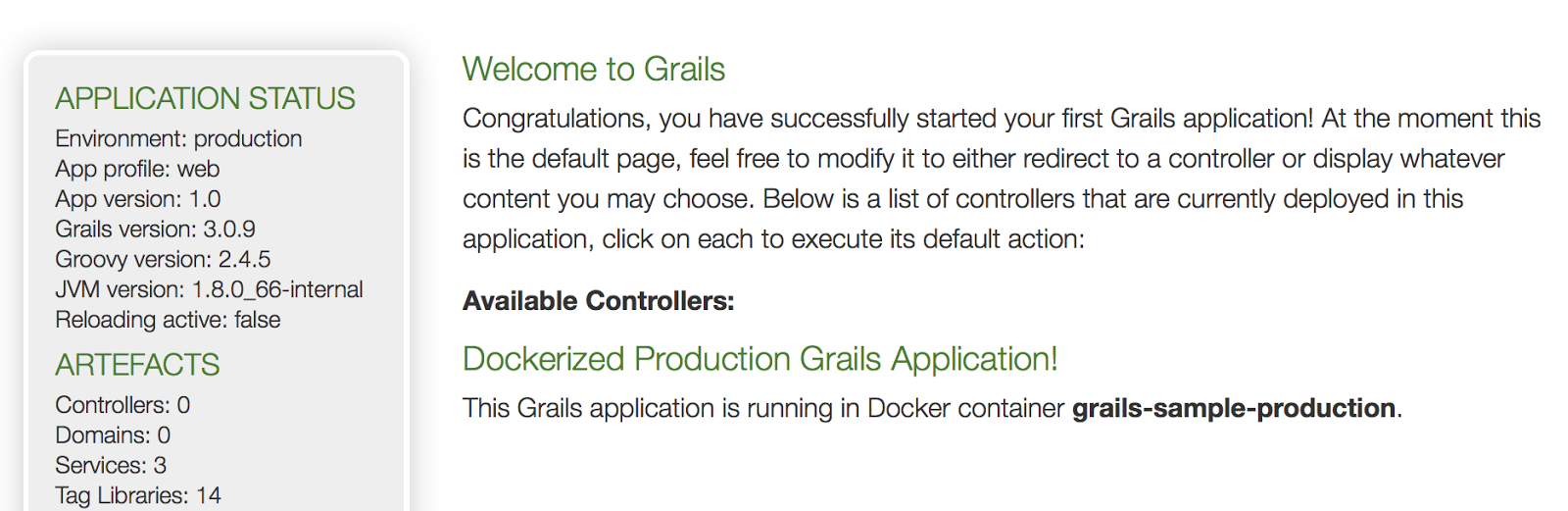In our web browser we open the index page of our Grails application and see how the current Grails environment is development and that the app.welcome.header configuration property is used from our application.properties file. We also see that the app.dockerContainerName configuration property set as command line argument for the Docker container is picked up by Grails and shown on the page: