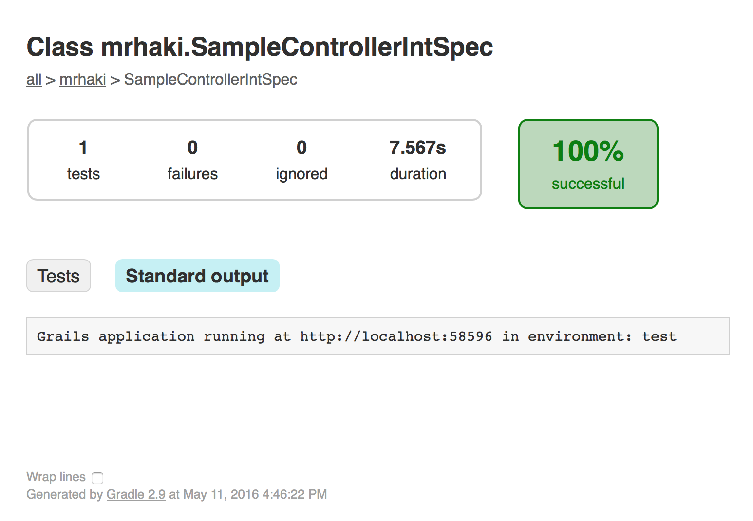 Let’s run the integration test: $ grails test-app mrhaki.SampleControllerIntSpec -integration. When we open the test report and look at the standard output we can see that a random port is used: