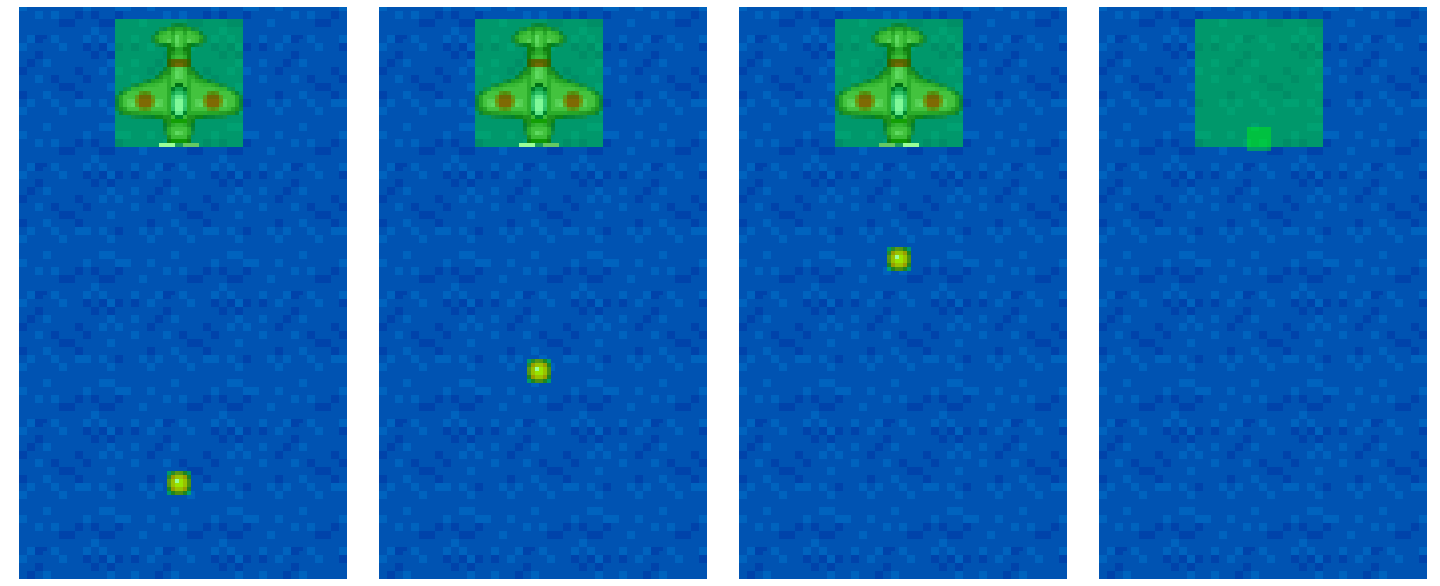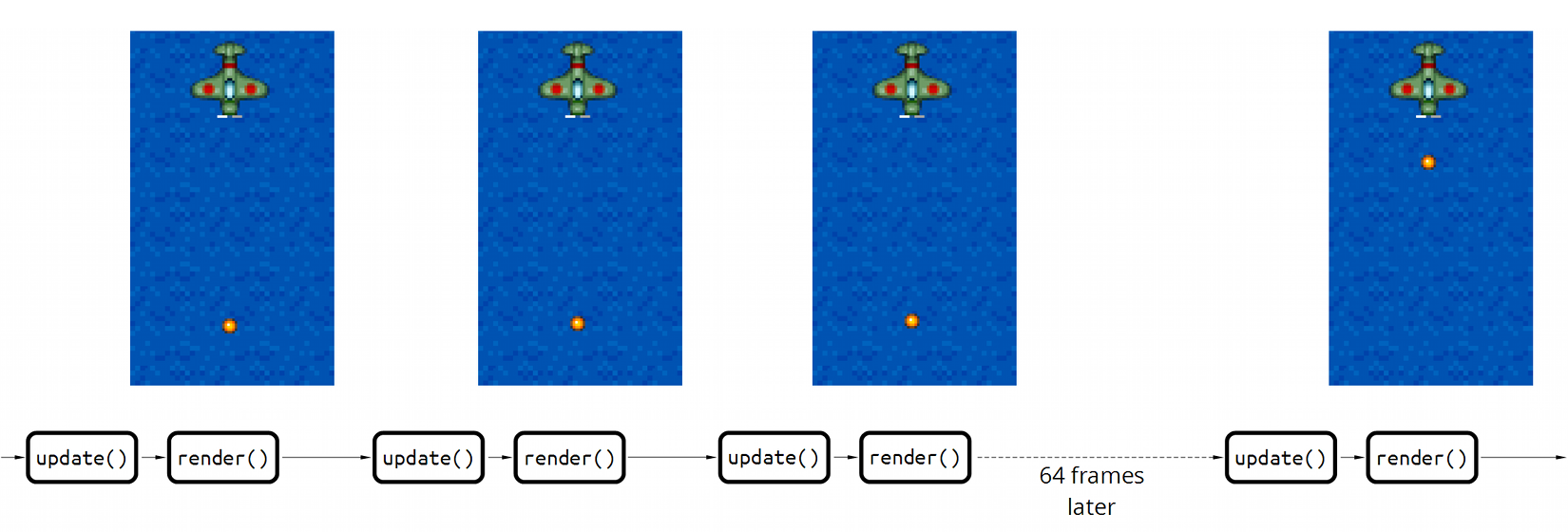 As mentioned above, Phaser will call the update() function at a regular interval, effectively moving the bullet upwards at a rate of around 60 pixels per second.