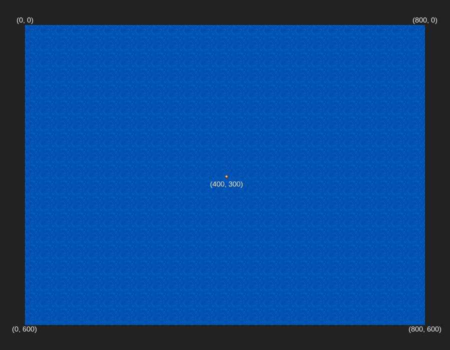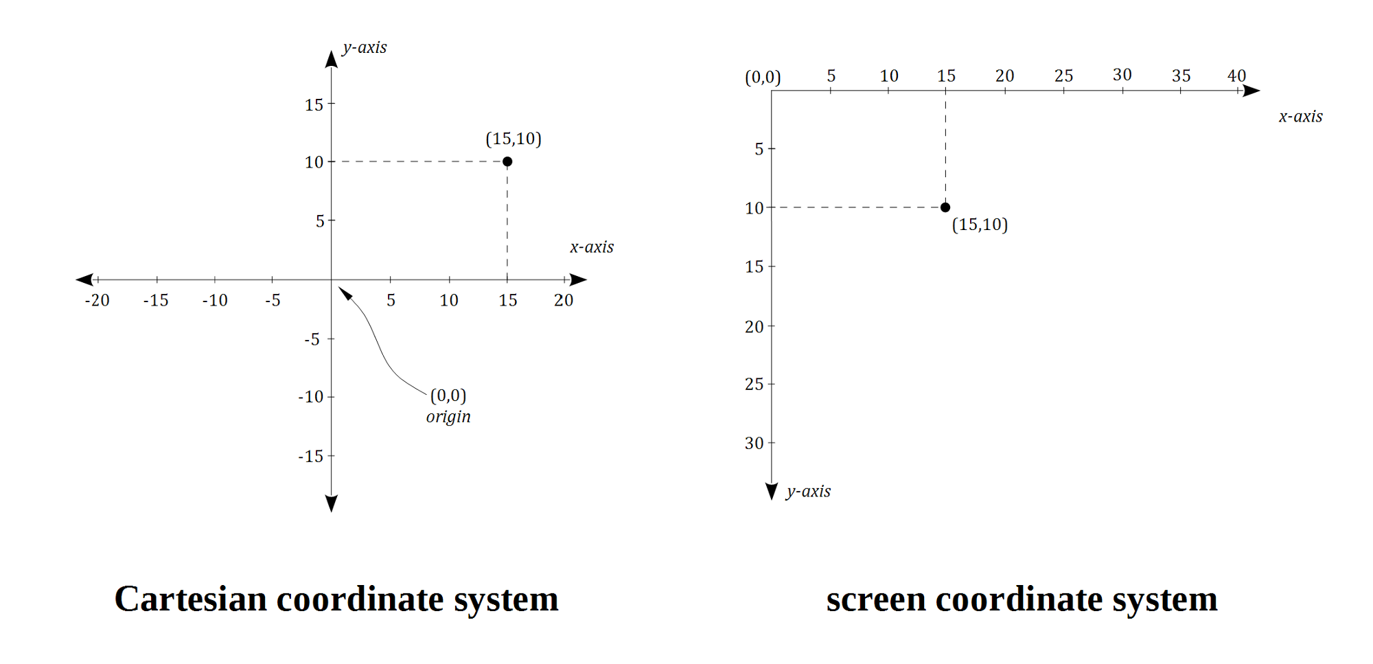 However, computer displays do not use Cartesian coordinates as is but instead use a variation: instead of being at the center, (0, 0) represents the point at the top-left, and instead of decreasing, y-values increase as you go down. This picture illustrates the screen coordinate system in our game at the moment: