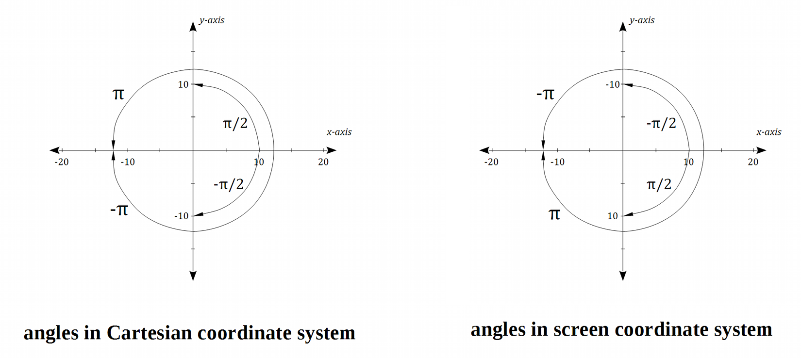 The rotation seems flipped (increasing angles are clockwise rotations rather than counterclockwise) because the y values for the two coordinate systems are flipped.