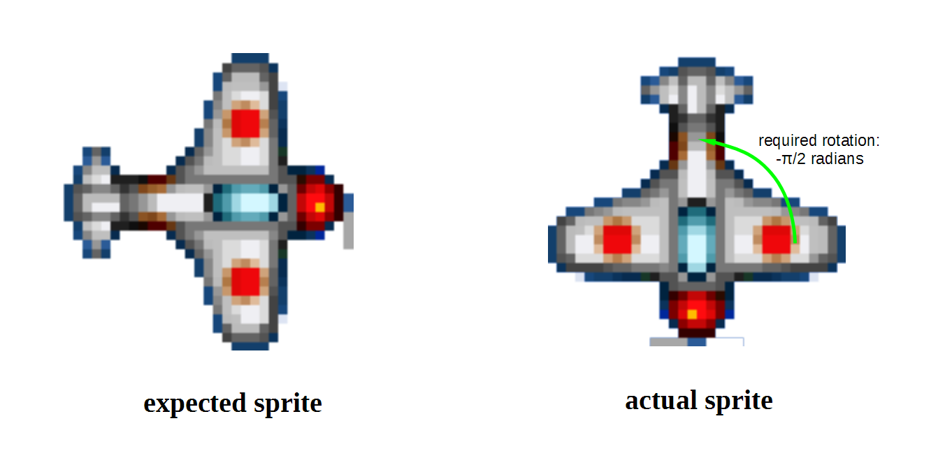This is because Phaser assumes that your sprites are oriented to the right. We rotated our sprite counterclockwise Math.PI / 2 radians (90 degrees) to compensate for the fact that our sprite is oriented downwards.