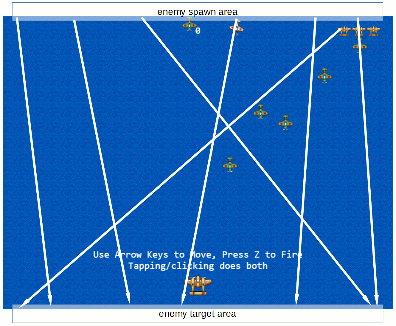 The figure above shows the initial spawn and target areas for the shooters; the arrows show possible flight paths. Here we’re using moveToXY(), a function similar to moveToPointer() which moves the object to a given point in the world.