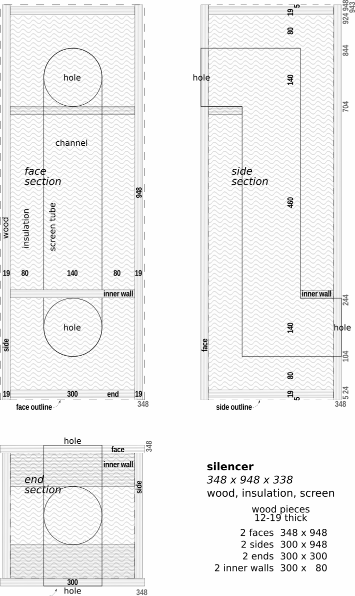 - enclosure (like silencer): use shortened version inside or out. It has fewer light-stopping corners because enclosure already has two or more. Attaches at side wall. See note in drawing and dash-dotted lines and measurements.
