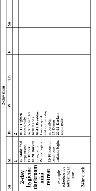 It takes time to properly readjust to light and ordinary life. So a period of unstressed transition back to it is just as important as darkness itself. For every three days of darkness, schedule one day of transition with sunlight. Uncover windows and spend time outside during daylight hours. Hand write a report about your retreat. Everything else about the retreat remains the same.
