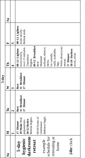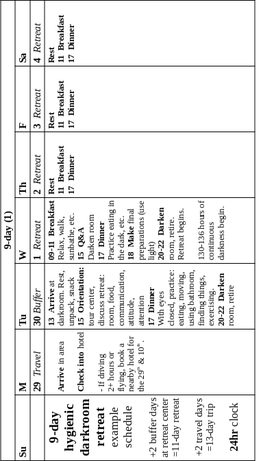 The human organism in darkness seems to go through a 48-hour cycle. The point of no return seems to be 16 hours. (I predict that research will bear this out.) So either exit a mini-retreat before going past this point or plan a 5-day retreat to complete the cycle.