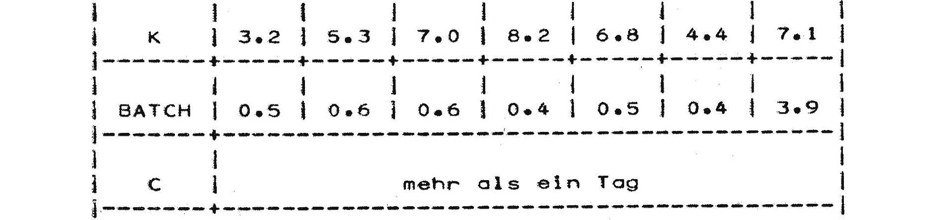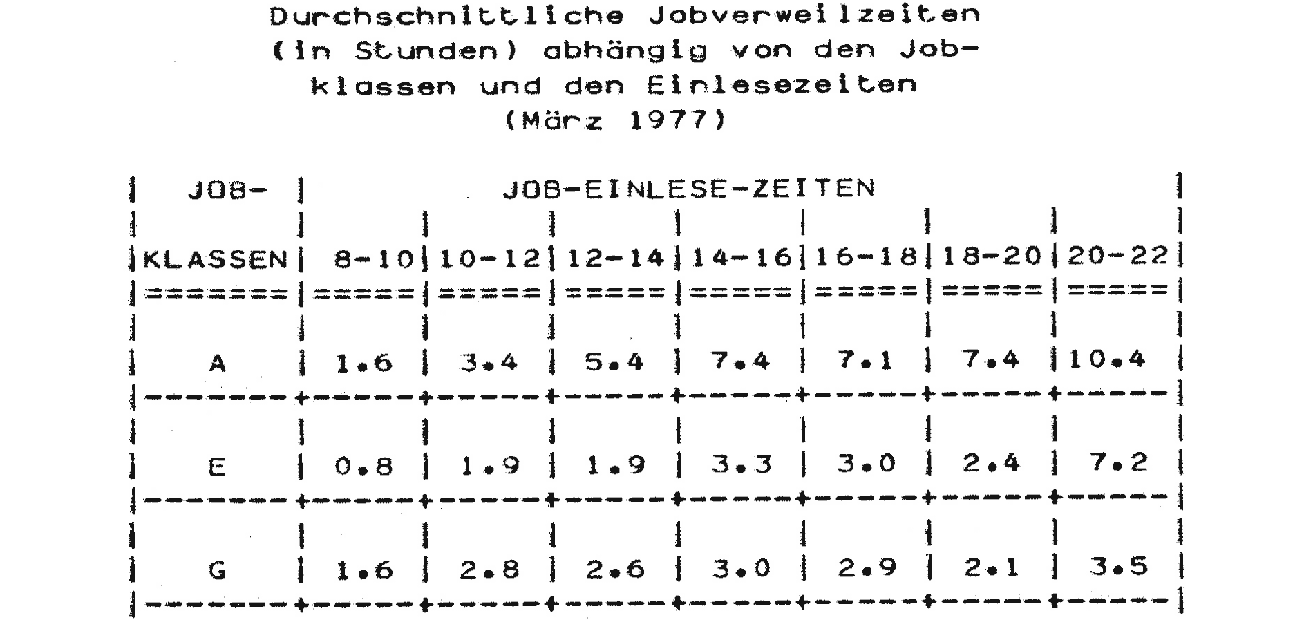 Die durchschnittliche Zeit, die ein Job vom Einlesen bis zum Drucken entsprechend seiner Klasse und Einlesezeit in der Maschine ist (Jobverweilzeit), kann für den derzeitigen Rechnerbetrieb der nachfolgenden Tabelle entnommen werden.10