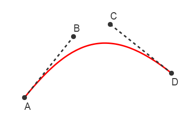 A Bezier curve is a versatile curve that can be used to create many different shapes. It is based on four points. The anchors, A and D are the end points of the curve. The control points B and C control the route the curve takes between the anchors.
