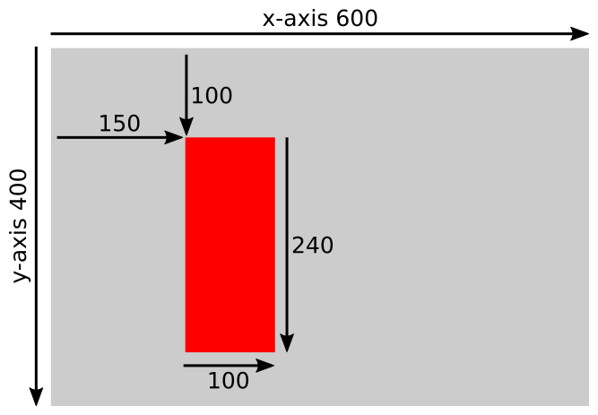 It specifies a rectangle placed at position (x, y) with the given width and height. Our code will place a rectangle at position (150, 100), with a width of 100 and a height of 240. We will explain how coordinates work in a little while.