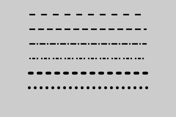 6. The final example illustrates a nice trick. The pattern is [0, 20]. The dash length is 0, but this zero length line still has a semicircle added to the start and end, creating a circular dot.
