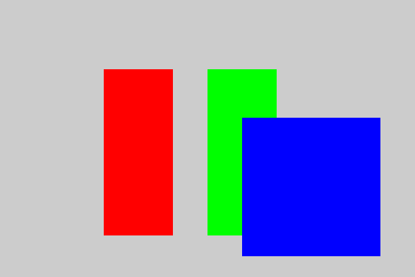 This code is similar to the previous example code, but we have extended it to draw 3 rectangles. In each case, we set the position and size (different for each rectangle), select the colour (a red, a green and a blue rectangle), and call fill to draw the rectangle.