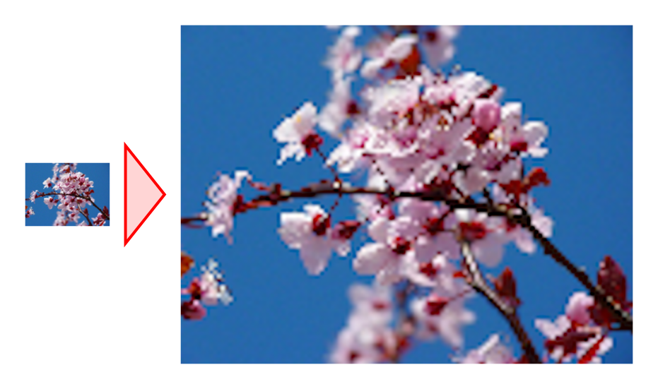 Trying to make a pixel image larger is usually less successful. A larger image contains more information than a small image. When you increase the pixel size of an image, you have no way of knowing what colour to make the extra pixels. If you wish to make the image slightly bigger, by 10% or maybe even 50%, the effect will be slight blurring. But if you try to increase the size more significantly, for example by a factor of 4, the result is a very poor quality image.