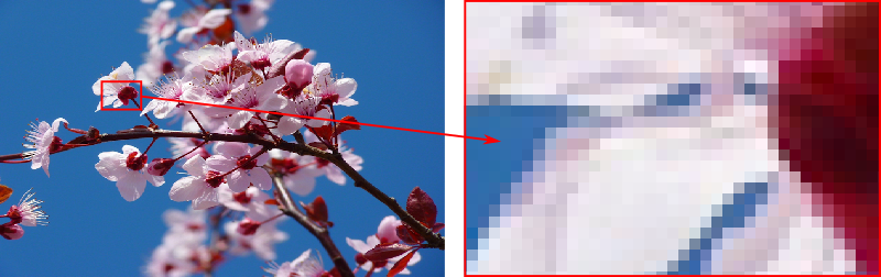 A pixel image is an image that is made up of pixels. You can think of a pixel as being a tiny square area of the image. Each pixel is too small to see individually, but if you zoom right in you can see them, as this illustration shows: